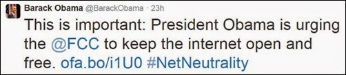On Tuesday, President Barack Obama came out strongly in favour of keeping current US Net Neutrality rules in place. He called on the FCC to "answer the call" heard in the millions of comments left on its website in support of net neutrality and implement "the strongest possible rules" to protect the principle. Obama said the FCC should create new rules so "neither the cable company nor the phone company will be able to act as a gatekeeper, restricting what you can do or see online".